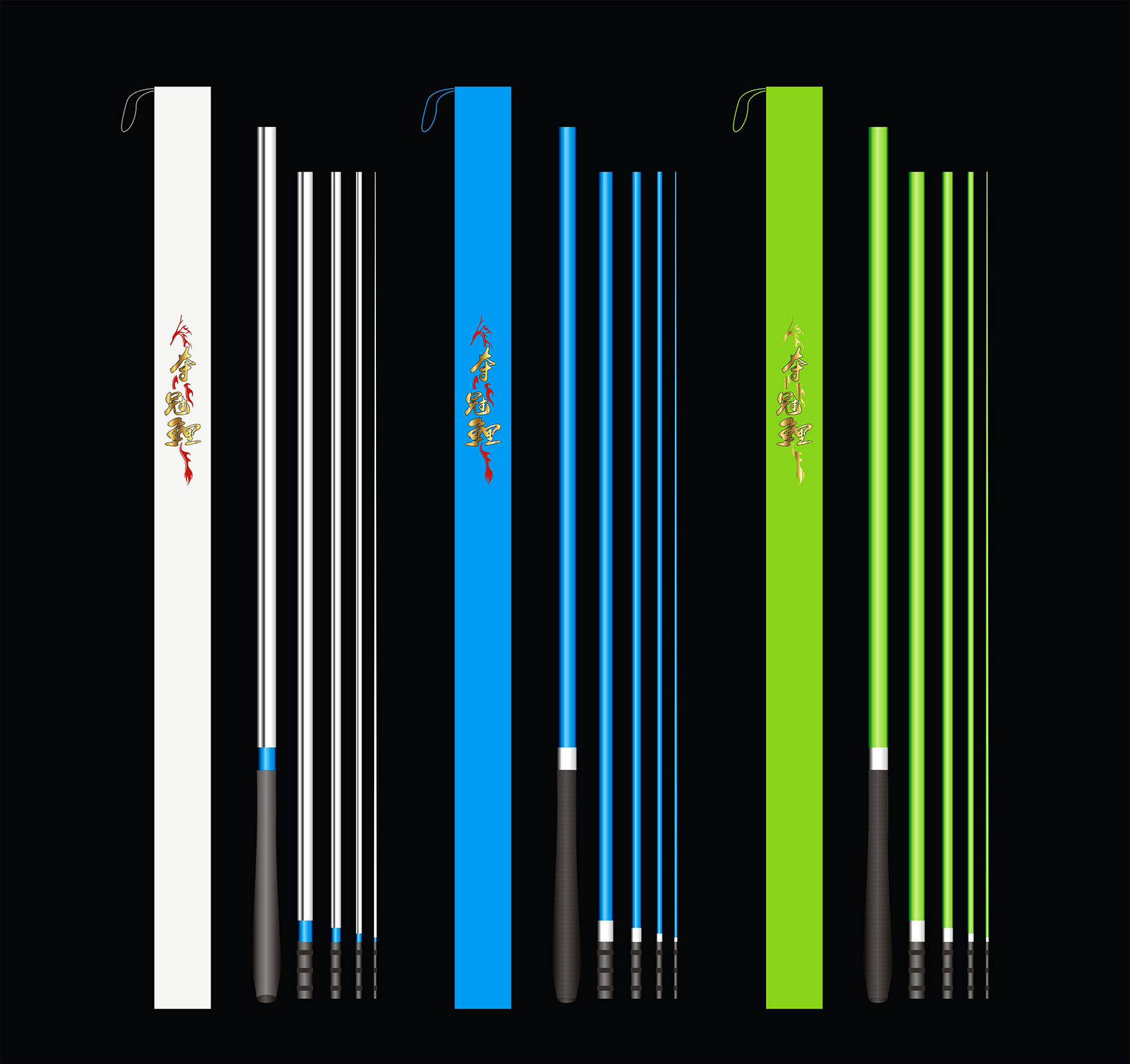 我想象中,這三款魚(yú)竿,采用電鍍漆的工藝,拿在手上噌亮的感覺(jué),應(yīng)該很好,包括竿架和抄網(wǎng),做成一個(gè)系列,